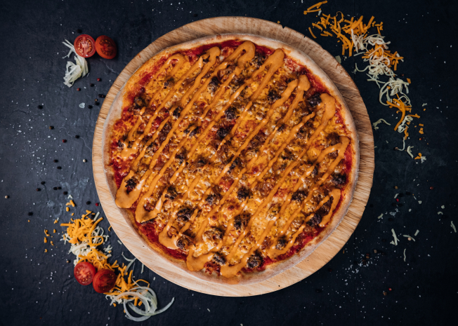 Legendární chuť teď i na křupavém těstě. Borkova pizza kombinuje všechno, co miluješ z Borkova hotdogu. Na poctivém základu se rozkládá rajčatová omáčka v okrajích pizzy a na pizze najdeš Borokov bidlo. Slanina, mexican pickles, hořčice a smažená cibulka tomu dodá ikonický křupavý finish.
