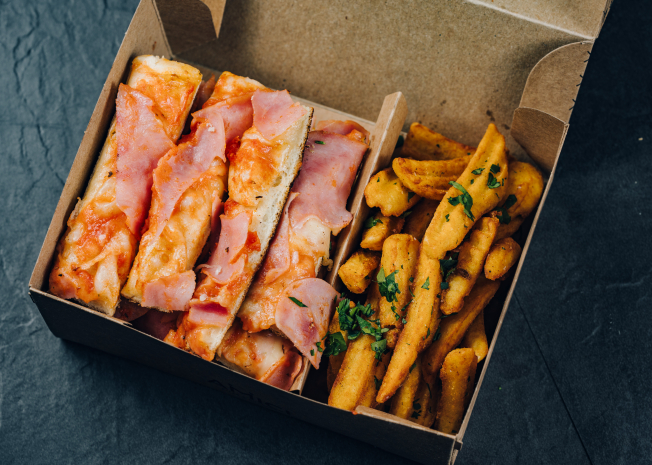 Objednej nejmenším dětský box - šunkové Sticks a hranolky. Snadno se jí, aniž by odpadávaly suroviny všude kolem.