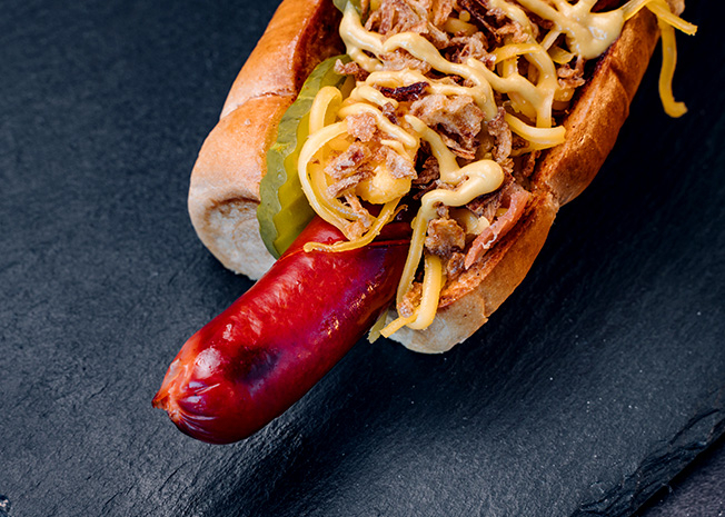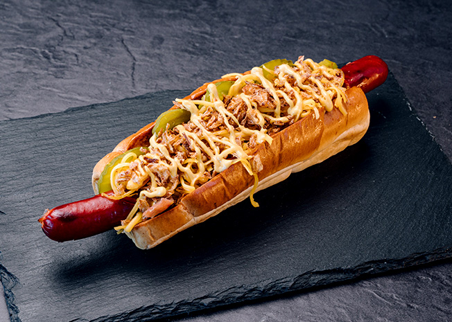 Tento hot dog není pro slabé povahy! Legendární 27 cm dlouhé borkovo bidlo ukryté v šťavnaté housce. K tomu chuťově poctivá hořčice, mexican pickles, cheddar a křupavá slanina a cibulka pro ten správný crunch.